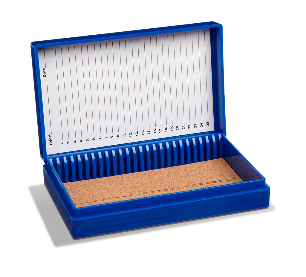 Caja para Portaobjetos con Corcho (Azul, 25 Portaobjetos) Caja para almacenar hasta 25 laminillas en plástico ABS, ideal para el trasporte y almacenaje de laminillas de dimensiones estándar de 26×76 mm. Sostiene las laminillas en forma vertical con ranuras para separar entre sí a los