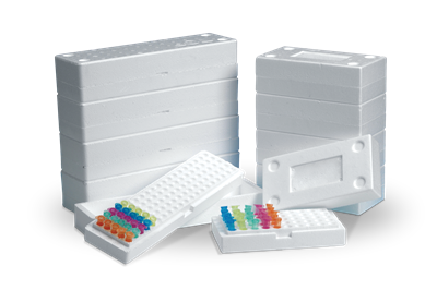 Caja para almacenar microtubos (50 lugares) Fabricada en espuma de poliestireno expandido EPS, unicel de color blanco, ocupa un espacio mínimo, son ideales para estudios a largo plazo, posee un agarre fácil, la tapa y la base cuentan con características de anidamiento y se apilan de forma segura.